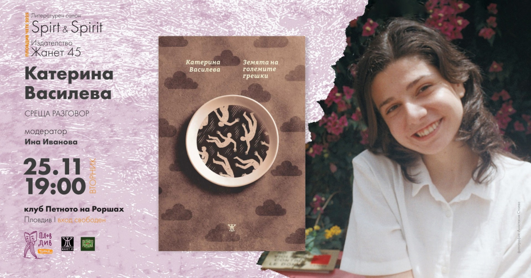 Среща разговор с младата поетеса Катерина Василева ще се състои в клуб "Петното на Роршах" от 19 часа тази вечер. Ще стане дума за силата на отделния човек, за големите несправедливости и малките ни победи, за умението ни да се отстояваме и да устояваме.