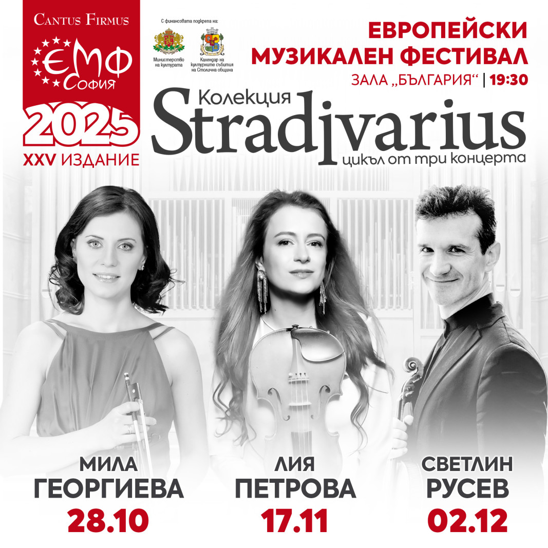 "Колекция Страдивариус" е цикъл от три концерта с участието на ярките български цигулари Мила Георгиева, Лия Петрова и Светлин Русев, които ще си партнират с орксетър "Кантус Фирмус" на 28 октомври, 17 ноември и 2 декември. Събитията са в зала "България" от 19:30 часа.