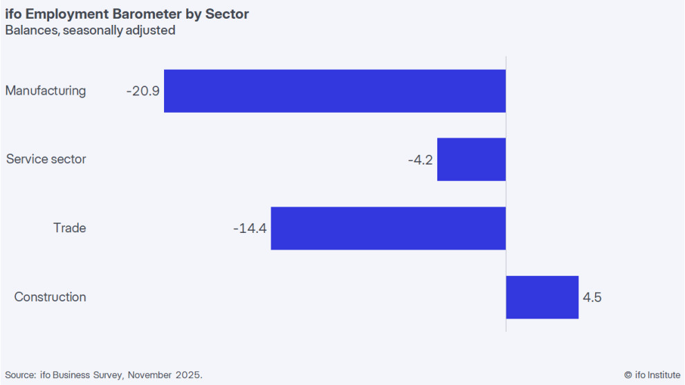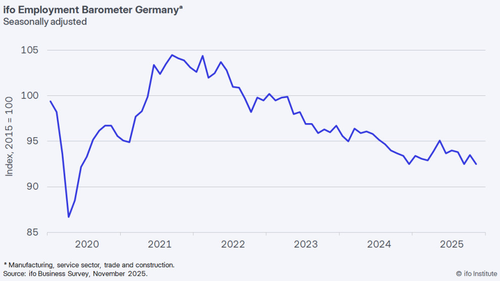 Компаниите в Германия са станали по-рестриктивни в планирането на персонала си, показва последно проучване на водещия икономически институт Ifo. Индексът на заетостта на Ifo падна до 92,5 пункта през ноември спрямо 93,5 пункта през октомври.
