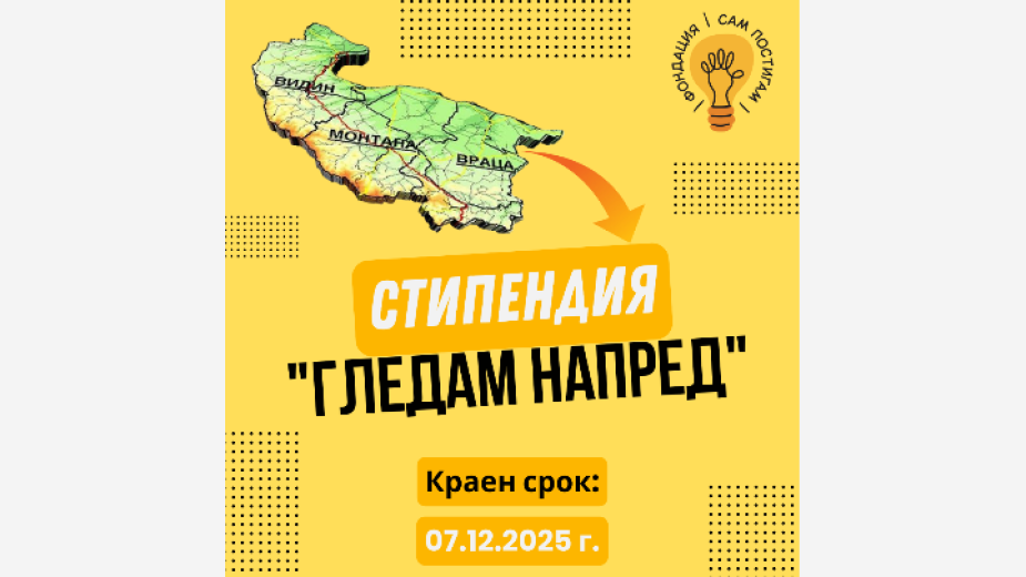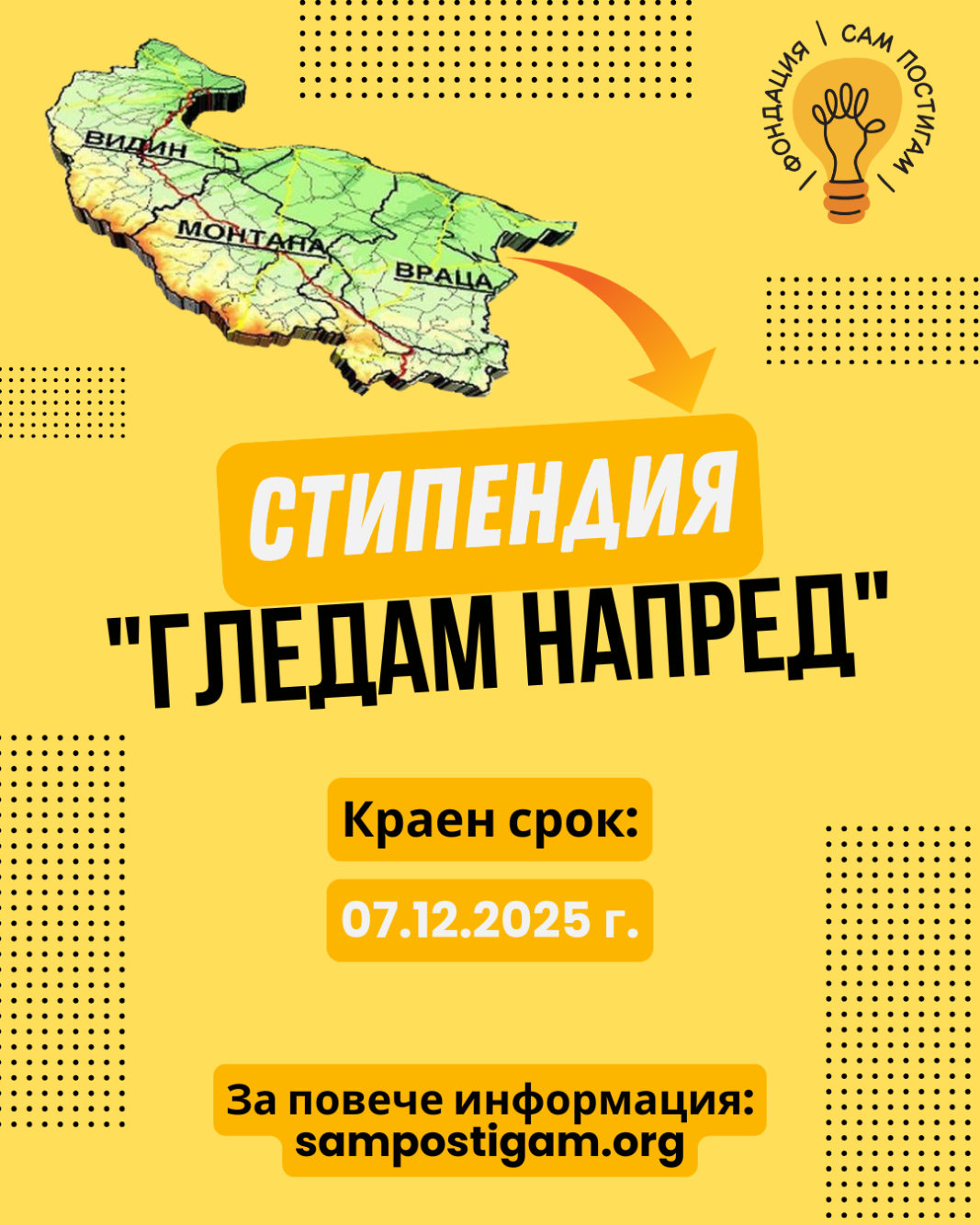 Регионален конкурс за стипендия „Гледам напред“  обявява Фондация „Сам постигам“. Той е насочен към ученици от области Видин, Монтана и Враца, които са лишени от родителски грижи и показват отлични резултати в училище. Стипендията е еднократна, в размер на 1000 лева, и цели да подкрепи ученик от 8 до 12 клас, който живее в институция/приемно семейство или е под грижата на роднини/настойници поради загуба на двамата родители.